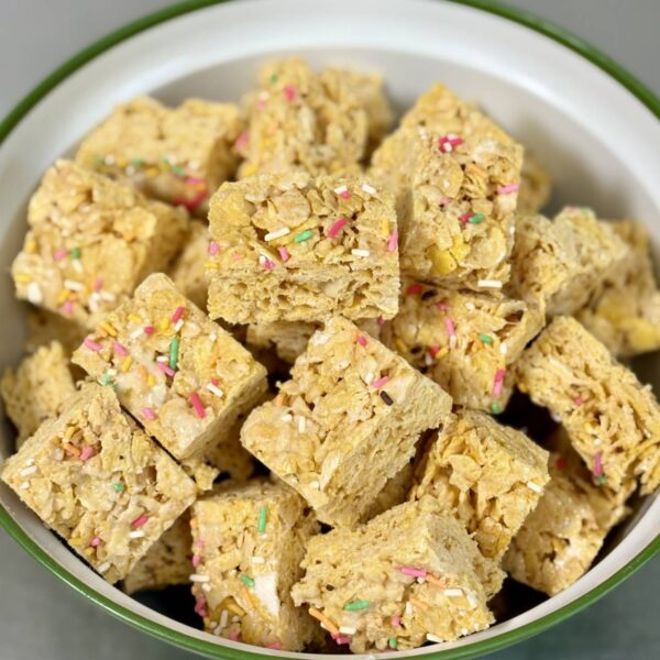 コーンフレークにバターとマシュマロを合わせて固めた、サクサク食感のお菓子です。