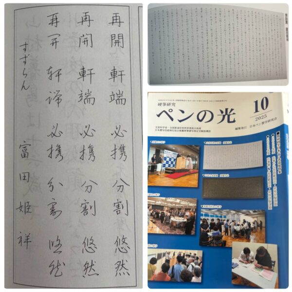 右上の長文の作品は、この夏の全日本ペン書道展にて奨励賞になった作品、左は日本ペン習字研究会の冊子「ペンの光」で選出された作品です。