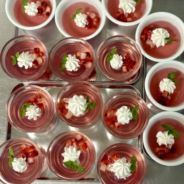 生クリームの上に小さないちごの実をのせたゼリーにミントをトッピング🌿