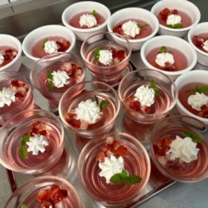 生クリームの上に小さないちごの実をのせたゼリーにミントをトッピング🌿