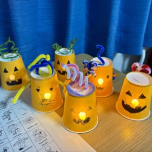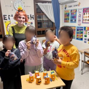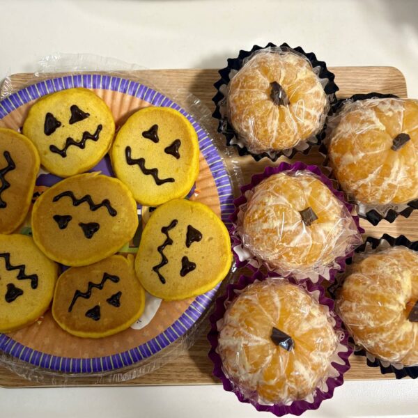 ハロウィーンの単語を覚えたり、ゲームやワークシートを楽しみました♪ハロウィーンのクラフトづくりは、光るジャコランタン⭐️そしてみんなお待ちかねの特別なおやつタイムでは、手作りのパンプキンパンケーキと、カボチャをモチーフにしたみかんをいただきました🍊✨最後に先生からお菓子のプレゼントをもらって大喜び❣️