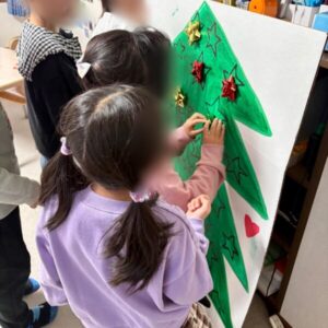 段ボールの巨大ツリーに飾りつけしたり、ビンゴや色塗り、クリスマスゲームに神経衰弱、椅子取りゲームまで盛りだくさん!