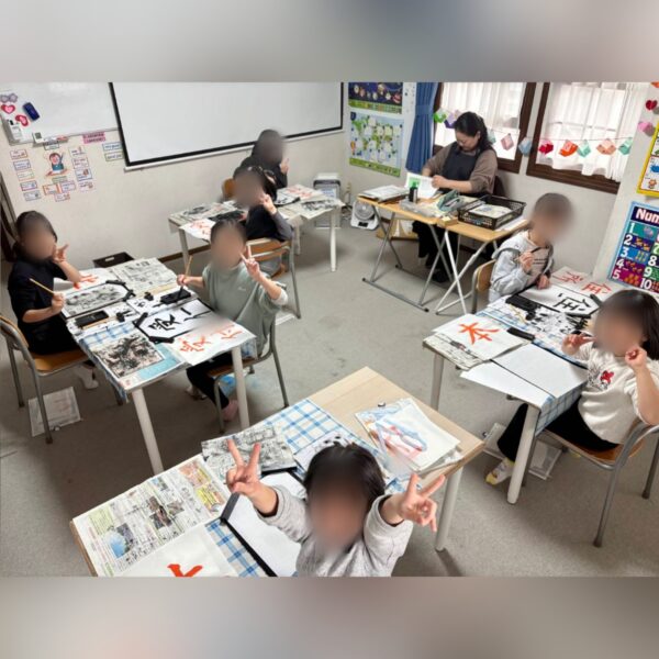 T先生の丁寧なご指導のもと、教室には静かな空気が流れ、子どもたちは真剣な表情で一画一画に向き合っています。墨の香りの中で、それぞれが自分の書に集中する時間です✨