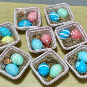 ゆで卵に食紅で色付けしてイースターエッグを描いたり、エッグハントで盛り上がったり、イースターゲームや物語の読み聞かせ、ワークシートにも取り組み、