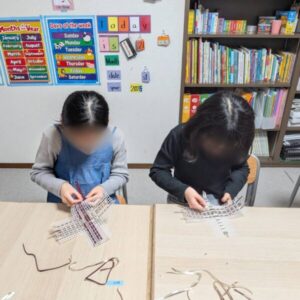 それぞれが好きな色のテープを選び、一本一本ていねいに通していくと…かわいい小物入れが完成しました😊